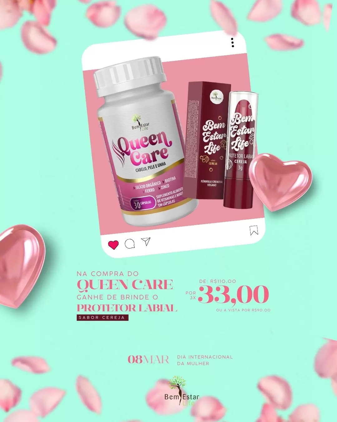 Na compra de um QUEEN CARE (Cabelo e Unha), GANHE um PROTETOR LABIAL SABOR CEREJA